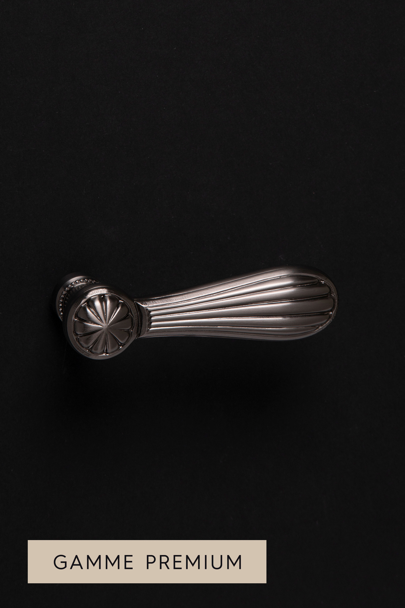 Béquille de style Renaissance, la base est une rosace « inspiration marguerite » et la poignée est habillée de godrons en relief.