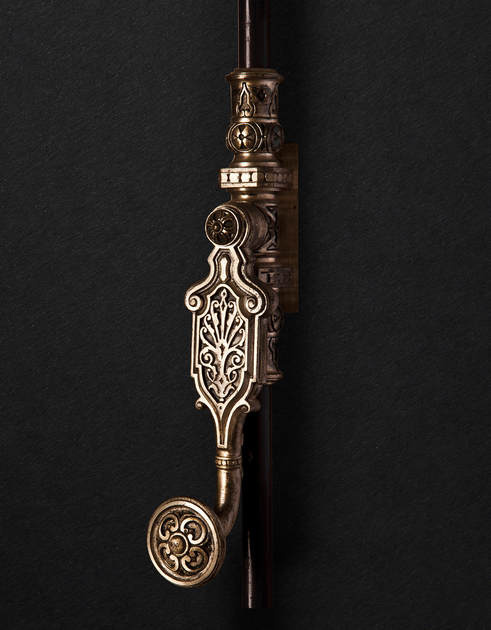 Espagnolette de style Renaissance, finement ciselée de motifs droits et plats, initialement ces motifs pouvaient être décorés de couleur à l’intérieur, ce sont des motifs répétitifs de géométrie. En haut de l’espagnolette on retrouve des croix ciselées, ornement typique du style « Renaissance ».