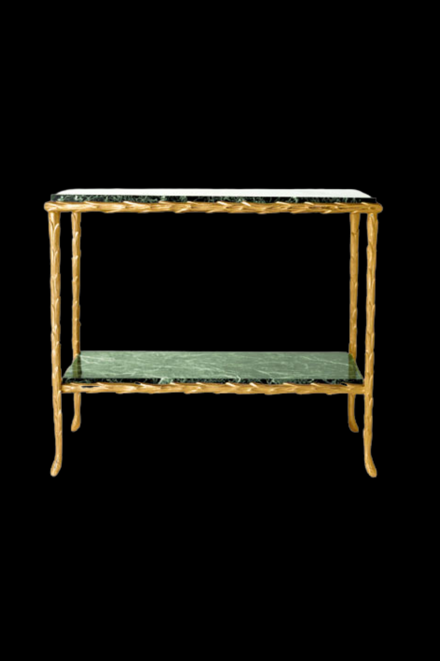Bout de Canapé en bronze doré à piètement «Jonc» à double plateau en marbre «vert Patricia».