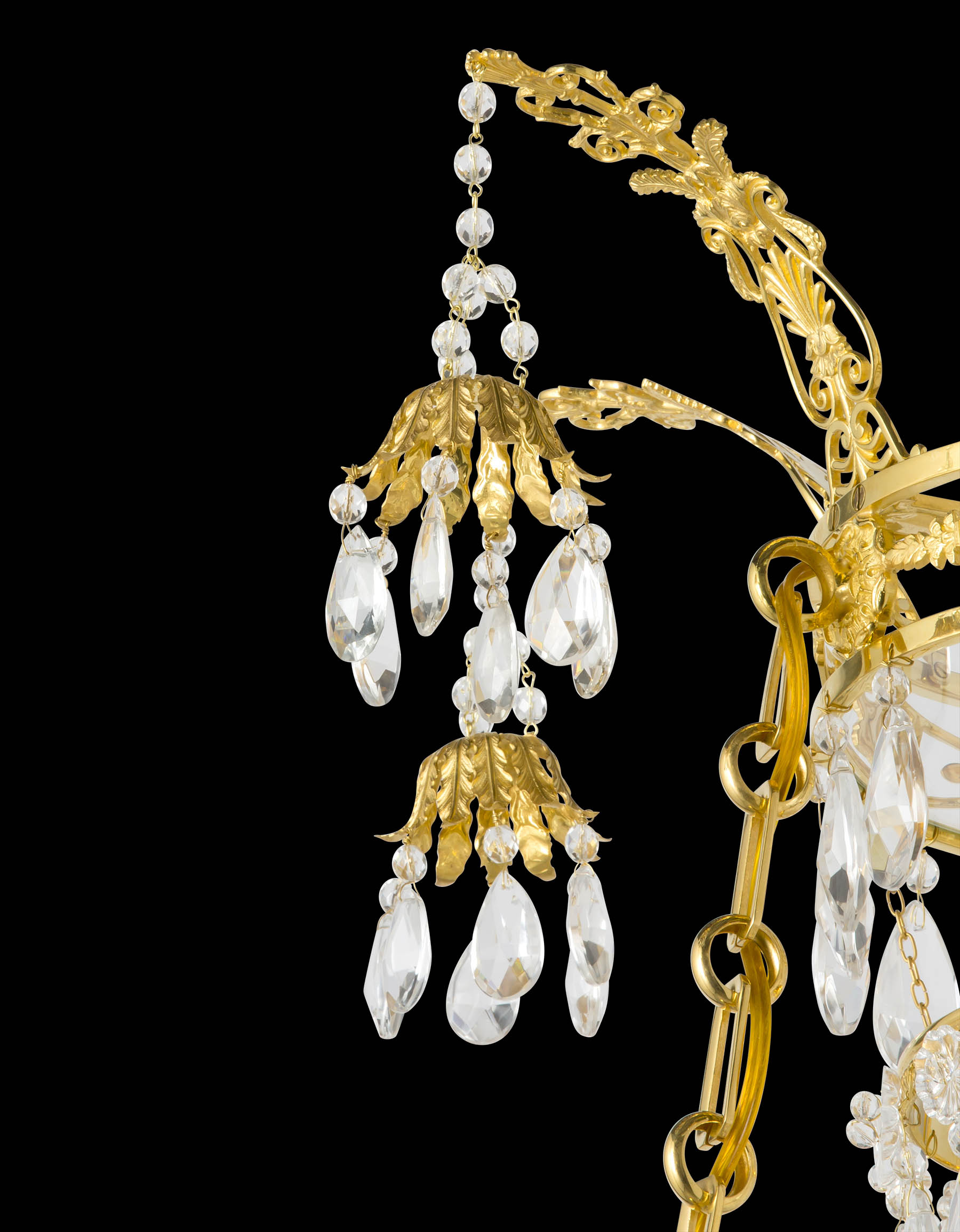 Lustre de style balte du XVIIIème en bronze, verre et pampilles en cristal taillé à seize lumières. Ceinture centrale à entrelacs parés de perles taillé à facettes. Amortissement et pavillon en couronnes concentriques de perles en amandes. Fût central garni d’un vase d’où jaillissent branches et guirlandes de perles.